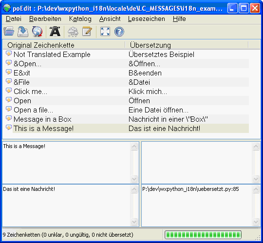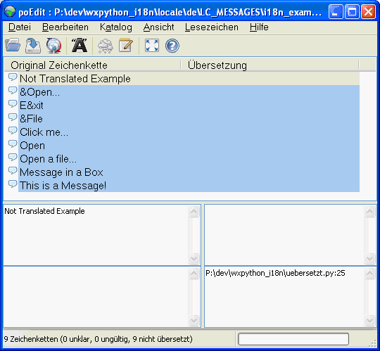 Der volle Pfad lautet also für dieses Beispiel: P:\dev\wxpython_i18n\locale\de\LC_MESSAGES\i18n_example.po
